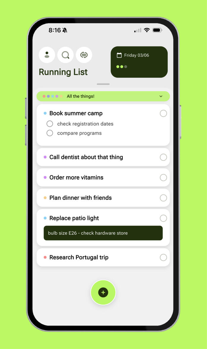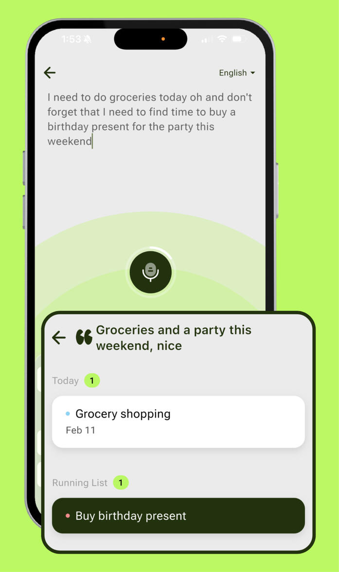 You don't need to categorize, prioritize, or set up a system first. You just say what's on your mind, and Thinkii catches it. The urgent stuff lands in today. The rest waits quietly in your running list until you're ready - no nagging, no red badges, no shame.