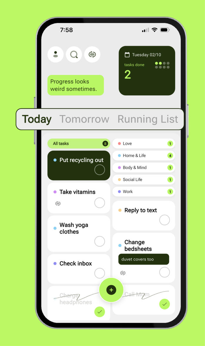 Thinkii keeps tasks across your life - home, work, self-care, and more.